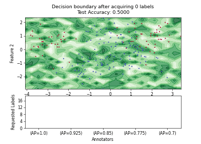 On this page, we illustrate how different query strategies behave across various active learning scenarios. To this end, we generate synthetic, low-dimensional toy datasets that allow us to visualize the distribution of samples selected for labeling in feature space. Each example consists of an animation and accompanying code that plot the results across individual active learning cycles.